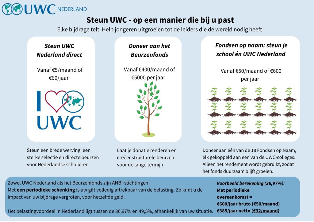 UWC zet zich in om ervoor te zorgen dat elke leerling de kans krijgt om UWC onderwijs te volgen, ongeacht sociaaleconomische, culturele, of religieuze achtergrond. UWC bereikt dit door selectie op basis van potentieel en verdienste, maar ook door het bieden van beurzen: meer dan 80% van de IBDP-leerlingen die zijn geselecteerd door een UWC Nationaal Comité, ontvangt volledige of gedeeltelijke financiële ondersteuning. Om dit werk voort te zetten, is UWC afhankelijk van donaties van voormalige leerlingen, trusts, stichtingen, bedrijven en overheden. Er zijn verschillende manieren waarop je de activiteiten van UWC Nederland kunt ondersteunen. Selecteer de meest handige optie voor uw omstandigheden uit de onderstaande opties. Dank!