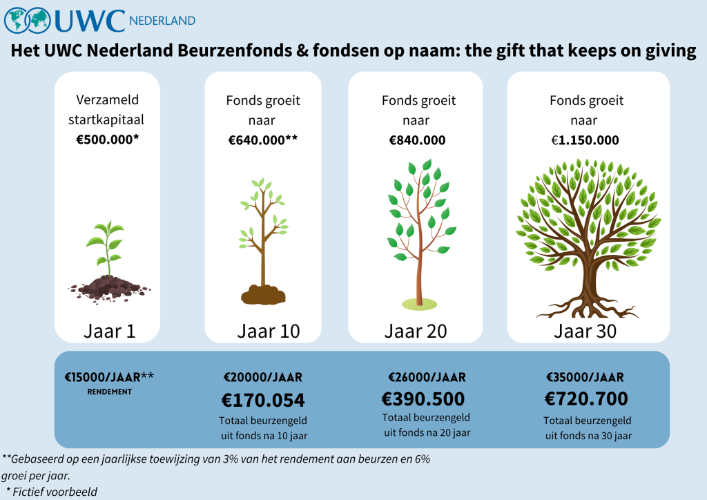 Donoren kunnen aangeven of hun gift bedoeld is om op korte termijn te worden besteed aan beurzen of om bij te dragen aan de opbouw van een vermogen (de “endowment”) waarvan het rendement wordt gebruikt voor beurzen. Op die manier kan het Beurzenfonds een stabiele beurzenstroom leveren en heeft UWC Nederland meer zekerheid over haar jaarlijkse budget.